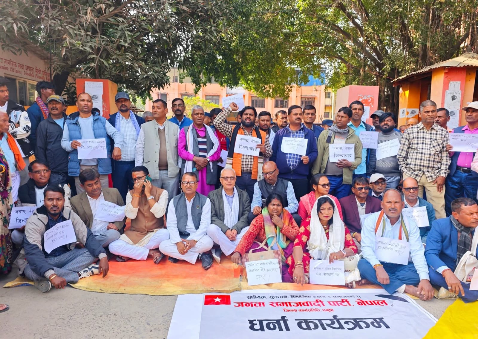 जनकपुरधाम २१ मंसिर । मधेश प्रदेशको राजधानी जनकपुरधामस्थित जिल्ला प्रशासन कार्यालय अगाडि जनता समाजवादी पार्टी (जसपा), नेपालले आइतबार दोस्रो दिन पनि शान्तिपूर्ण धर्ना कार्यक्रमलाई निरन्तरता दिएको छ।
