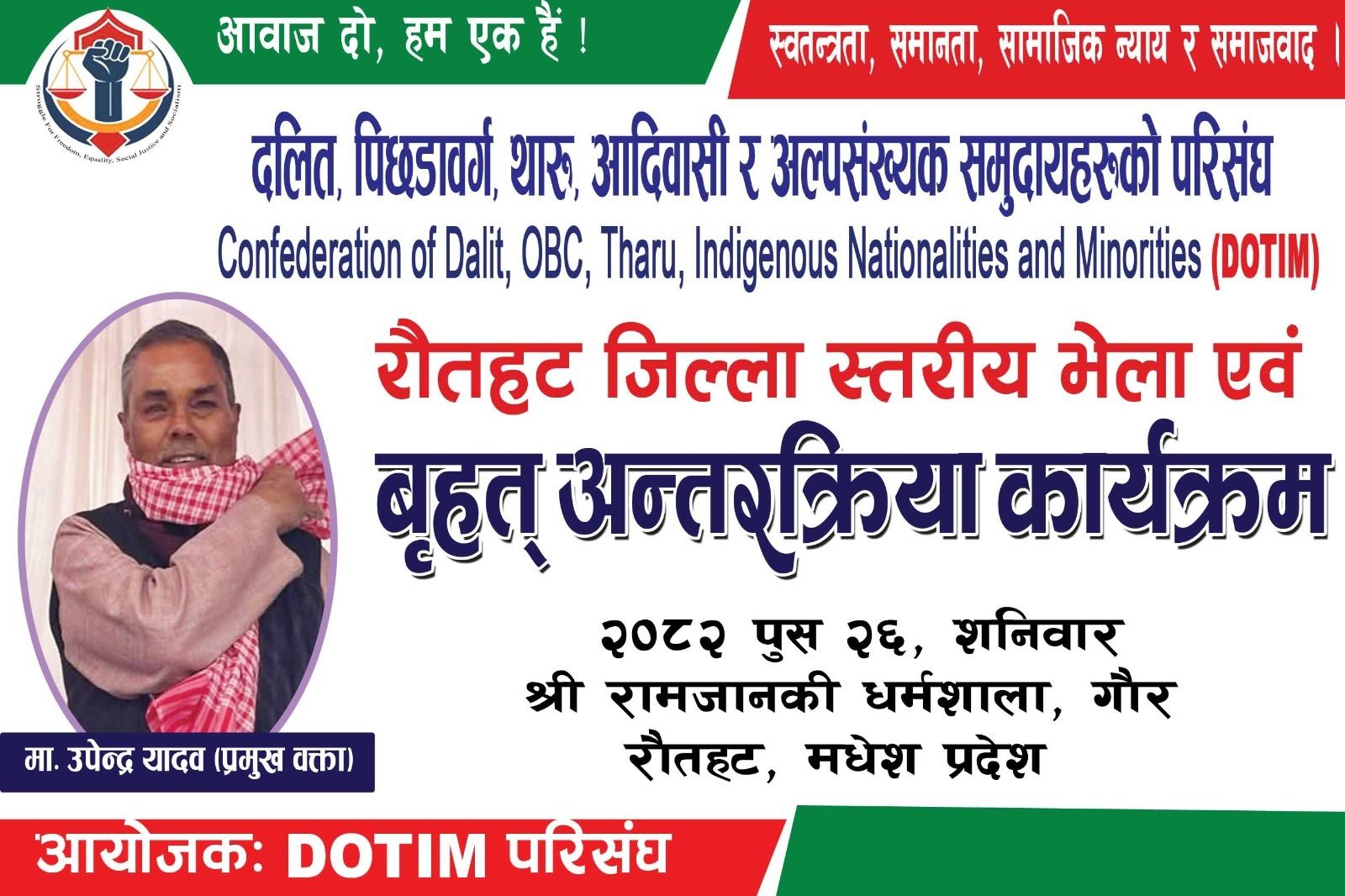 सितल साह , रौतहट, २२ पौष । दलित, पिछडावर्ग, थारु, आदिवासी जनजाति तथा अल्पसंख्यक समुदायलाई एकताबद्ध गर्दै..